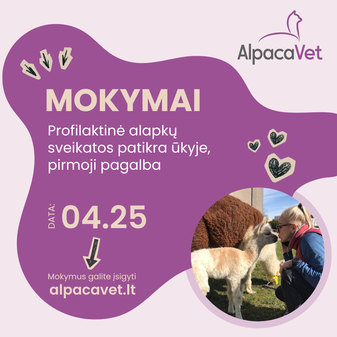 Mokymų metu bus aptariama: bendri alpakų anatomijos ir fiziologijos ypatumai, profilaktinis alpakų sveikatos tikrinimas (įmitimo įvertinimas, gleivinių apžiūra), dažniausiai pasitaikantys ligų simptomai, kaip juos atpažinti, pirmoji pagalba.